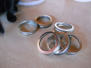 Then I use a screw top (canning jar band) on each jar to secure the lids. I had this little stack of screw tops just right and then Laila, our cat, started playing with them (sigh 🙂 ). I screw the lids to “hand tight”, but not too tight: