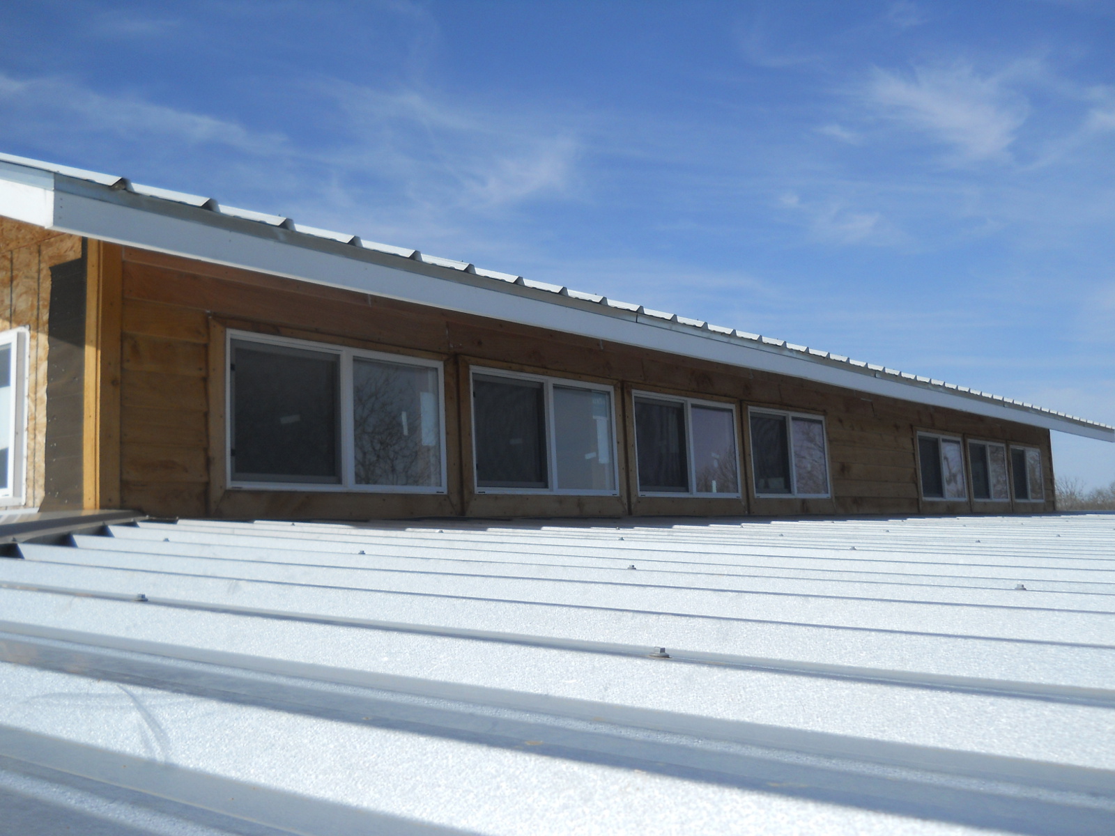 Here is some of the R30 rolled out. Maneuvering the big rolls of insulation in the trusses while trying to make sure to only walk on the trusses, and having to lay down to get the insulation in place at the low end of the trusses, was a little more difficult that anticipated. Some of the grommeted screws from the roof metal got my shirt and the top of my head 🙂 :