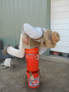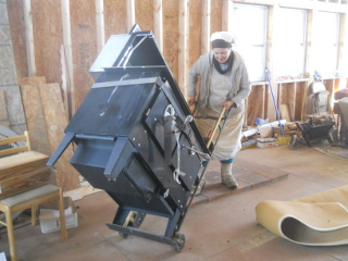 The stove has been hooked up to a dolly since we moved it into the house, and Sue and I were able to get it to tilt back on the dolly so we could move it. I tried pulling the stove up onto the stones using the dolly, but couldn’t get it to roll up them. Here, Sue is maintaining the lean while I do some prep work: