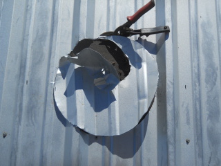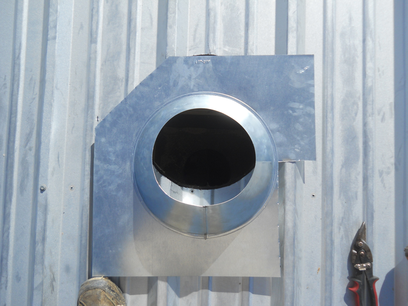 The external stove pipe is held in place with a collar, so I needed to further prepare the roof metal to receive the collar: