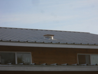 Something needed to be done to cover the hole in the ridge left by the circle cut, and so I took a piece of left-over collar flashing, bent it and placed it, and caulked it in place:
