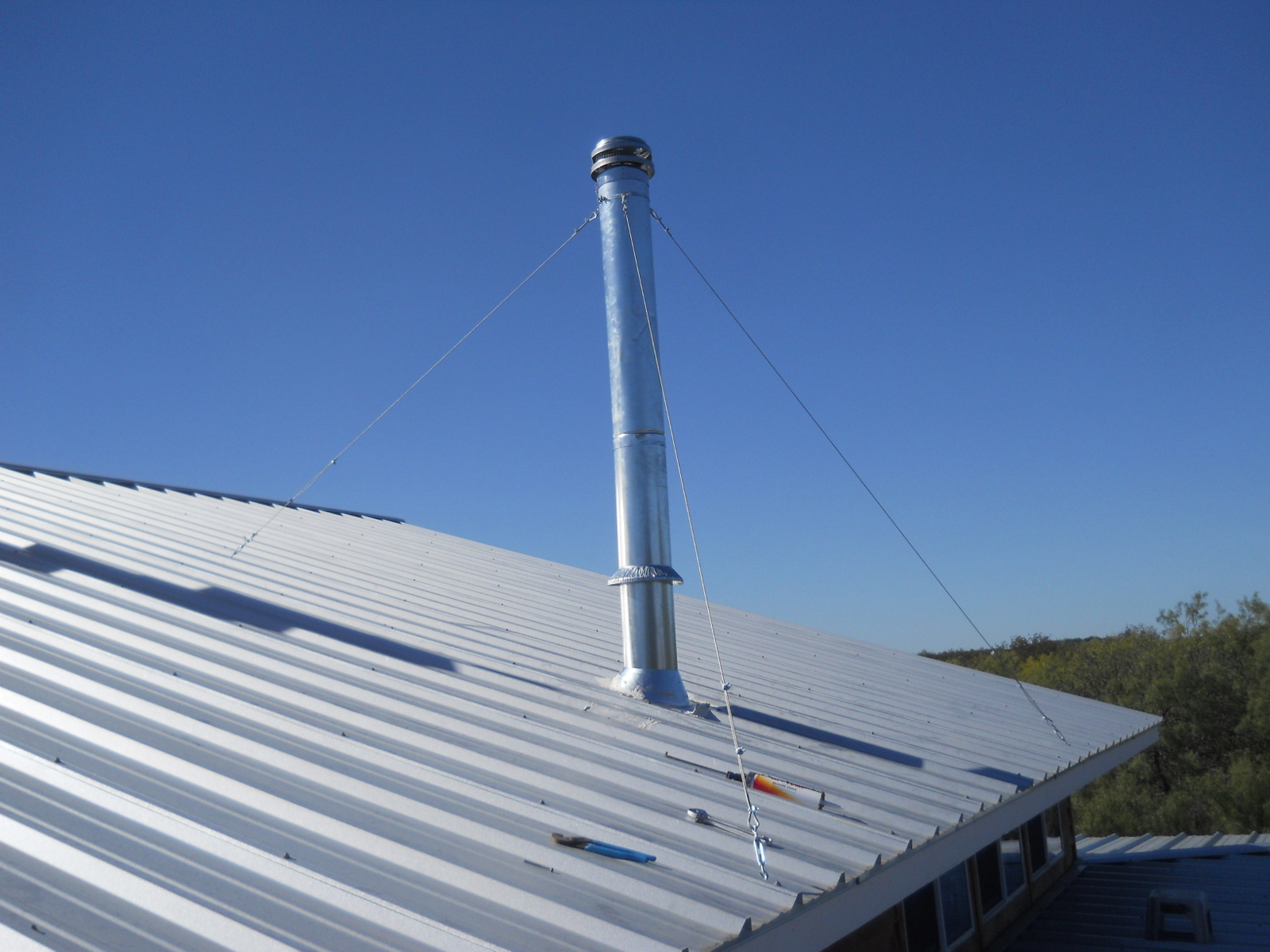 After that, I realized that the stove pipe was kind of jack-knifing at the pipe joint, and so I loosened the tension on the guy wires, straightened the pipe, and added screws to the pipe joint: