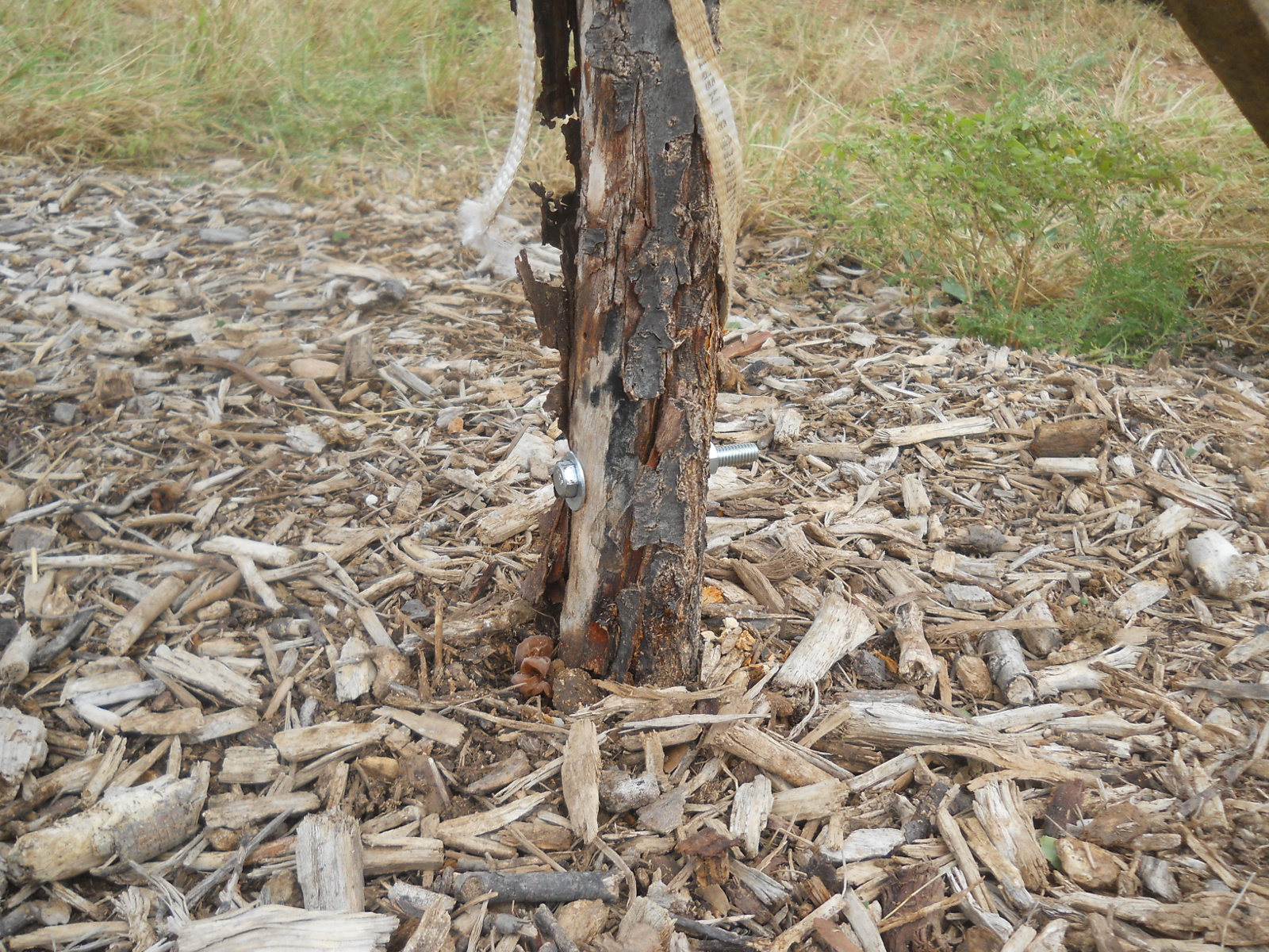 After a little research, we propped up the tree, secured it to t-posts and cinder blocks in three places with a 2×4 brace behind as well, and I bolted the two broken parts of the trunk together — apparently that’s supposed to work. So, Lord willing, this apricot tree will heal and continue on its life.