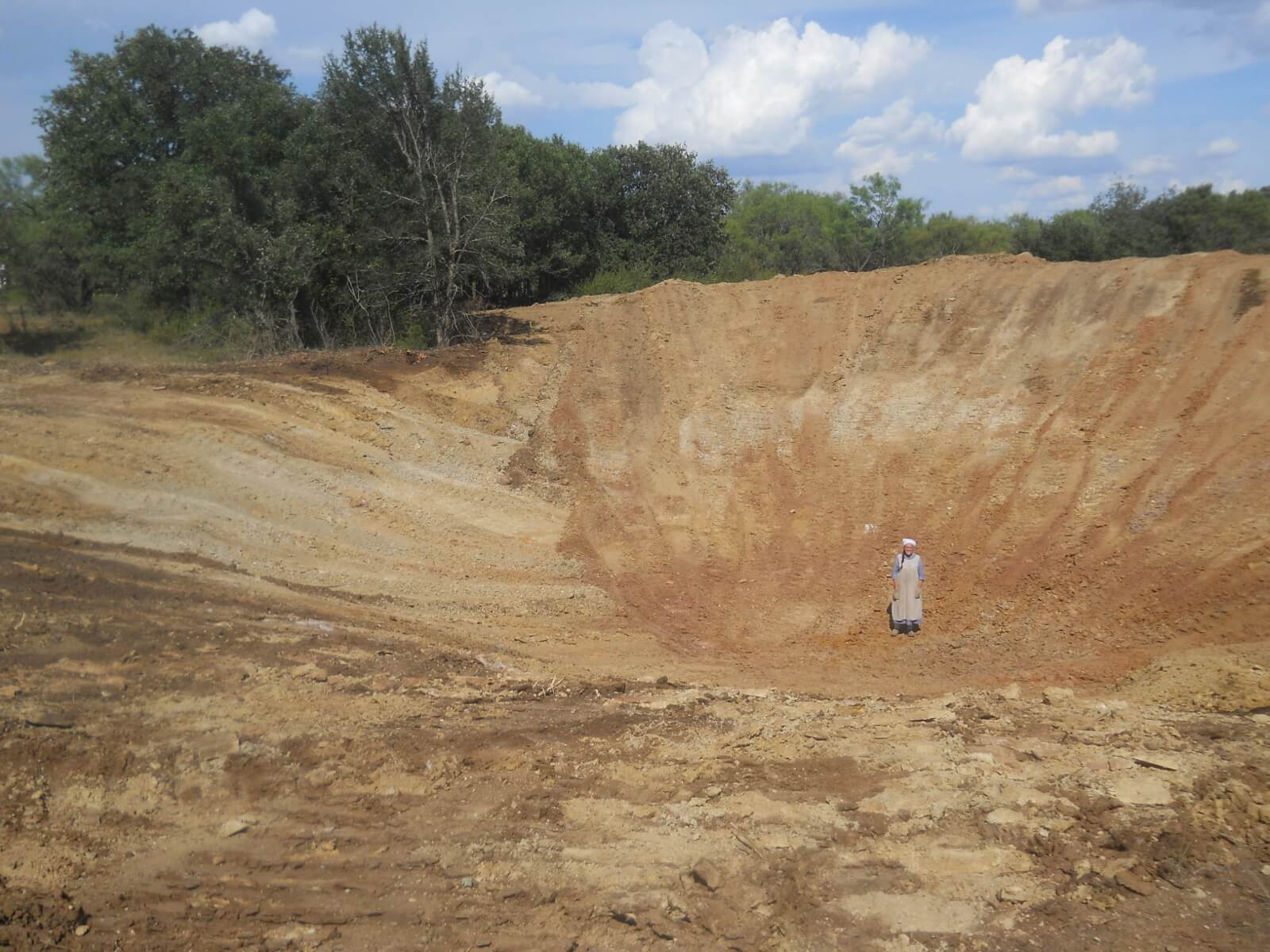 Between knocking down trees and digging, they didn’t get a lot of dirt moved that first day, but here is the progress after day 2. Sue’s there to give some perspective of the size of the dug-out area: